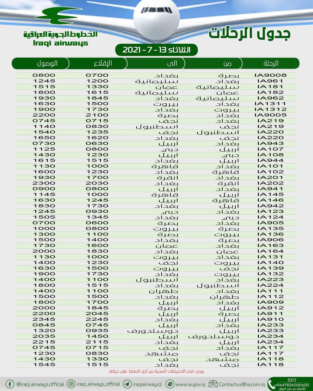 أعلنت الخطوط الجوية العراقية، اليوم الخميس، عن جدول رحلاتها ليوم غد الجمعة.