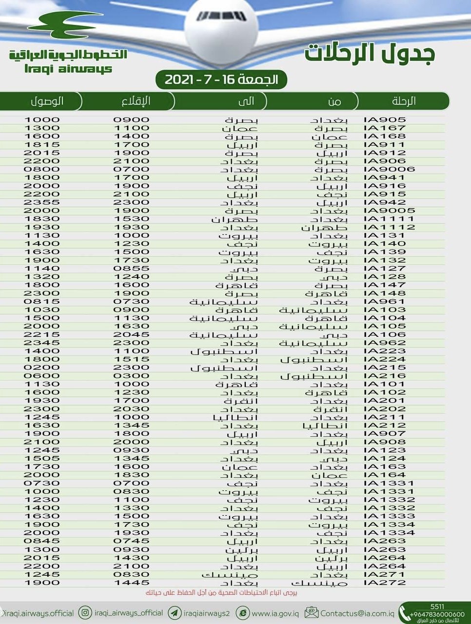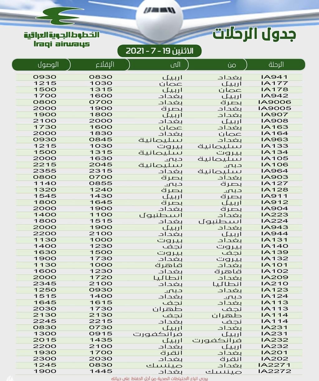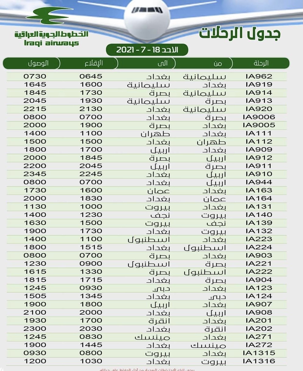 أعلنت الخطوط الجوية العراقية، اليوم الجمعة، عن جدول رحلاتها ليوم غد السبت