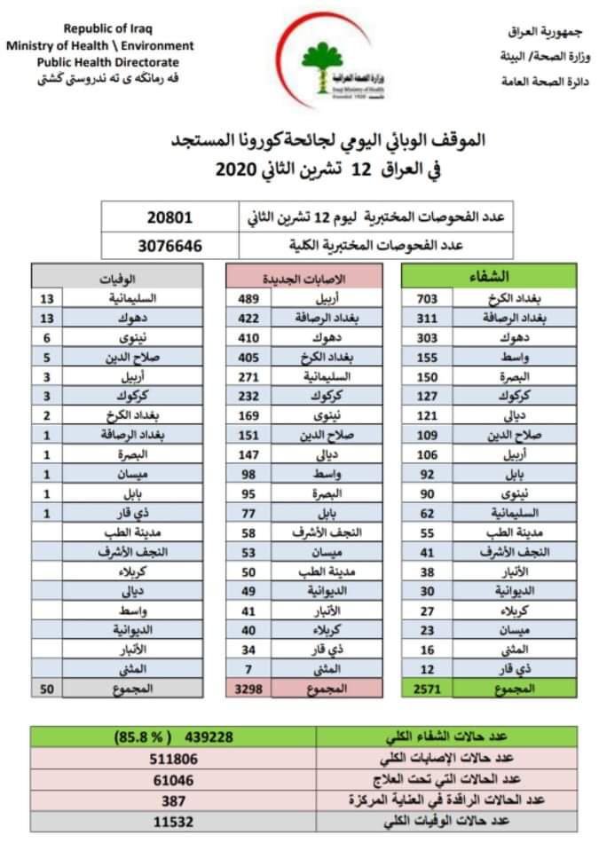 أعلنت وزارة الصحة والبيئة، اليوم الأربعاء، تسجيل 3198 إصابة جديدة بفيروس كورونا وشفاء 1992 حالة في عموم العراق.